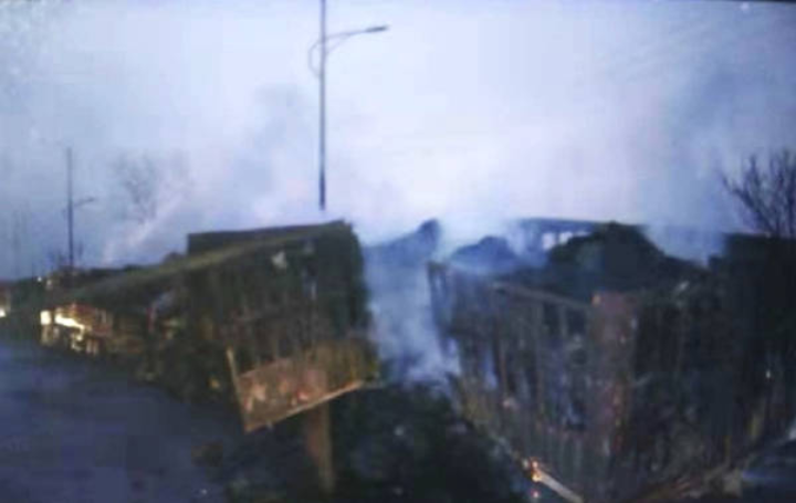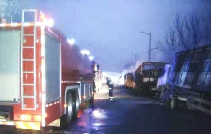 經(jīng)初步調(diào)查,事故中過火大貨車38輛、小型車12輛。現(xiàn)場搜救工作和事故原因調(diào)查仍在緊張進行中。